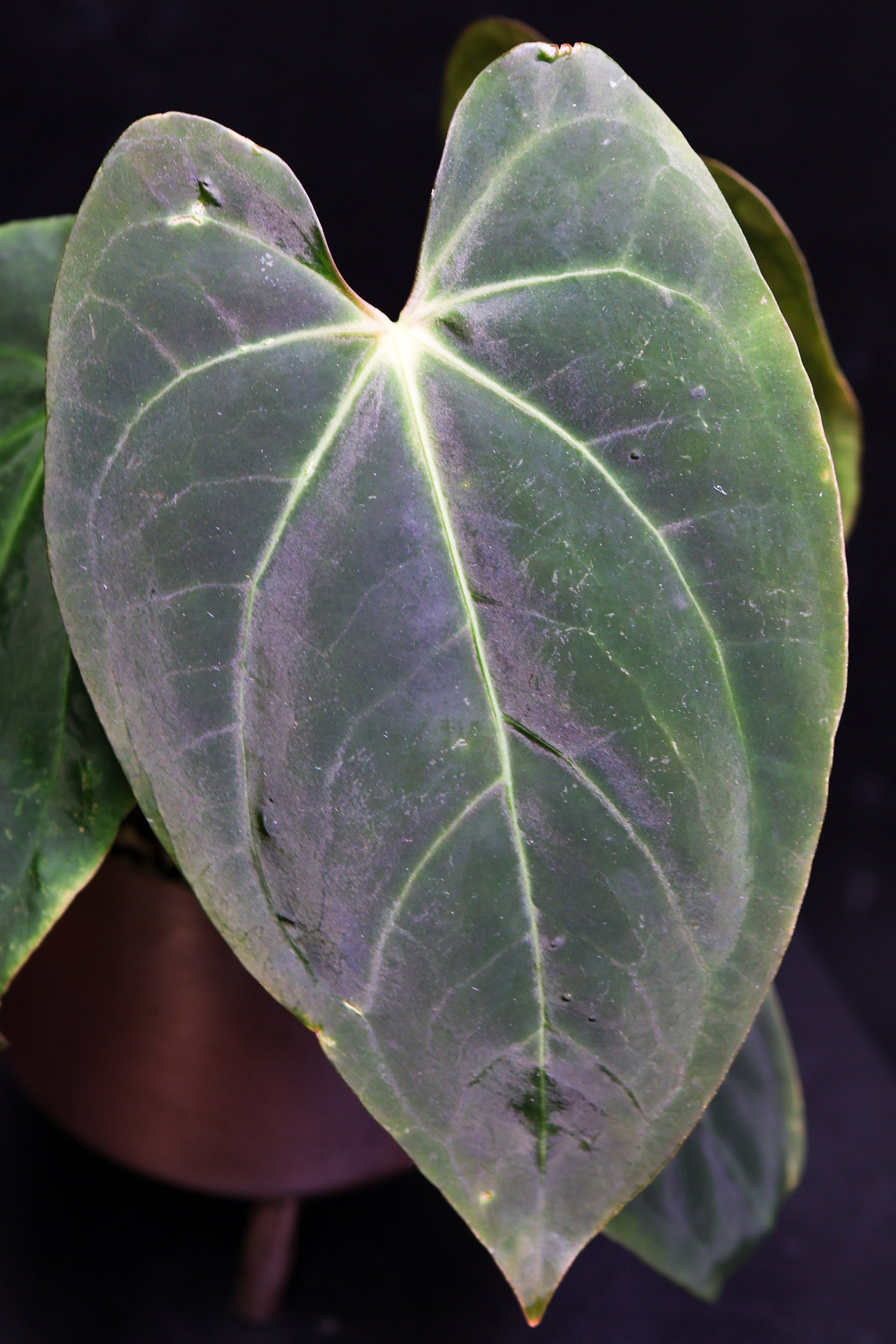 The Anthurium Papillaminum X Carla is a highly sought after hybrid known for its dark, heart shaped leaves with velvety texture and prominent veining.