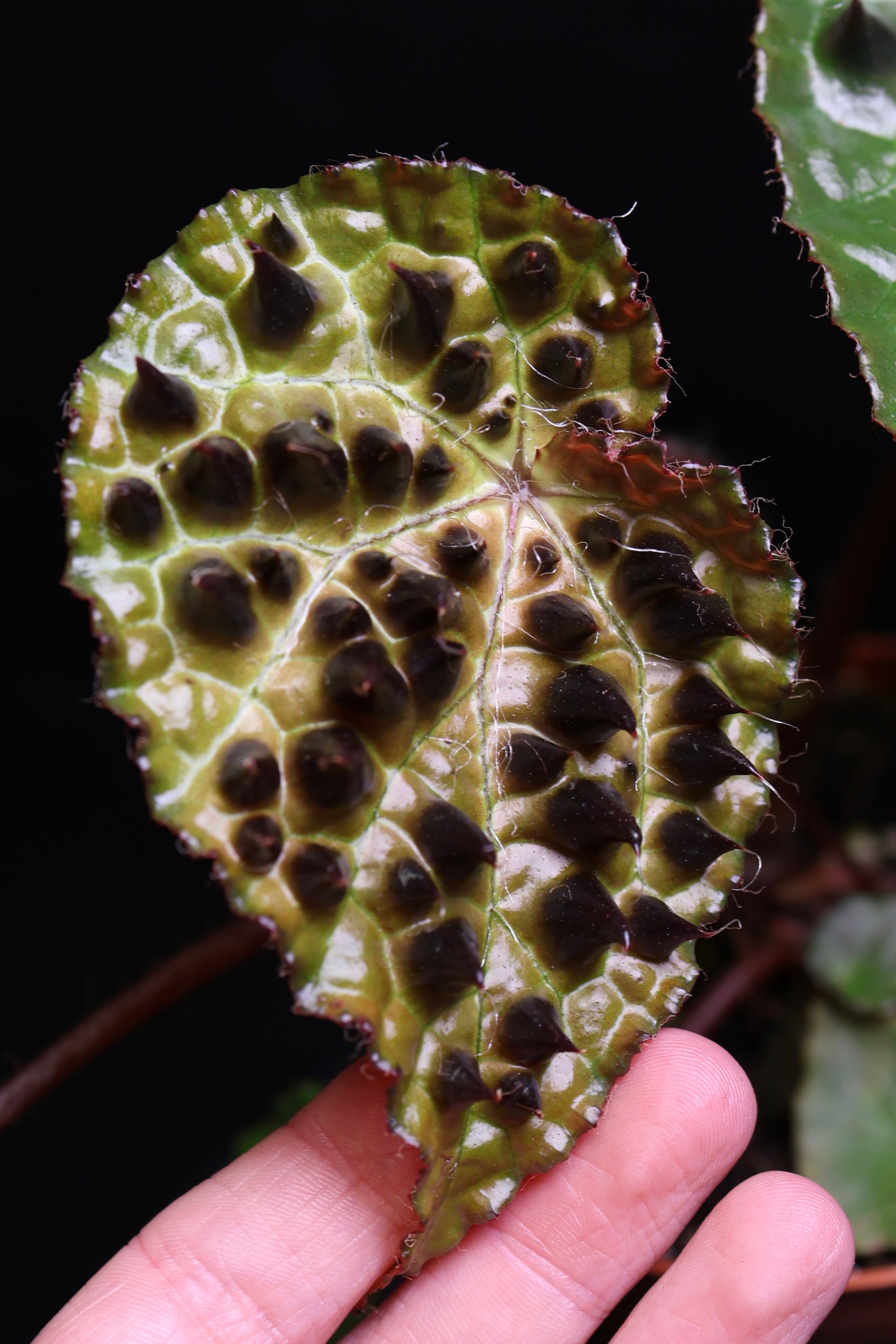 The Begonia Ferox is a rare, rhizomatous species plant from China. They are known for their green leaves covered with soft, spiky, "horn-like" structures called bullae that appear as the plant matures.