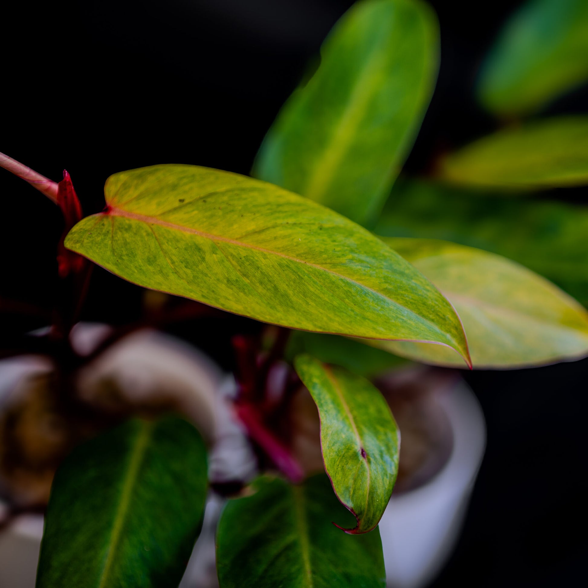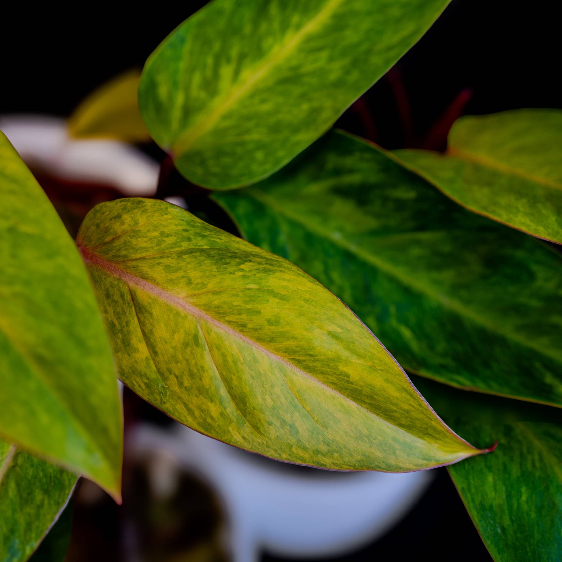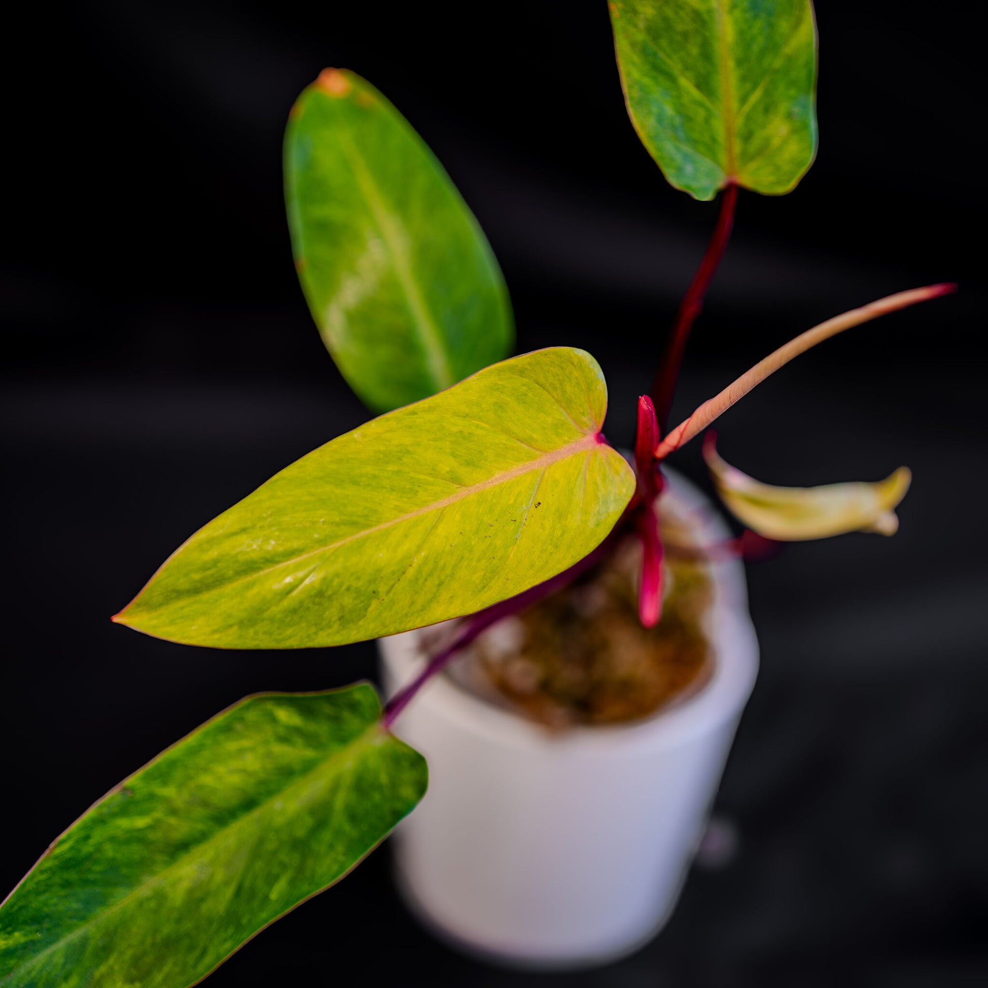 The Philodendron Medisa features vibrant red petioles and intricately patterned leaves in shades of yellow and green. Its new leaves emerge a bright, fluorescent yellow, with colors intensifying in brighter light.