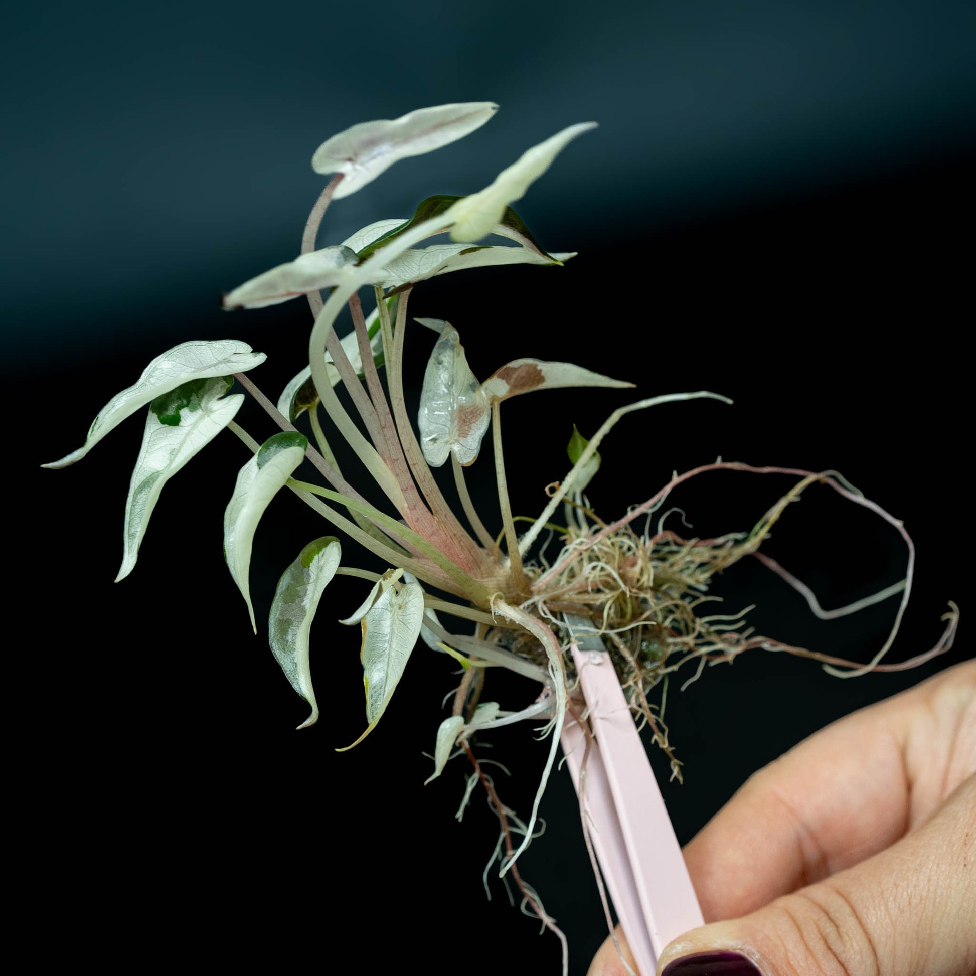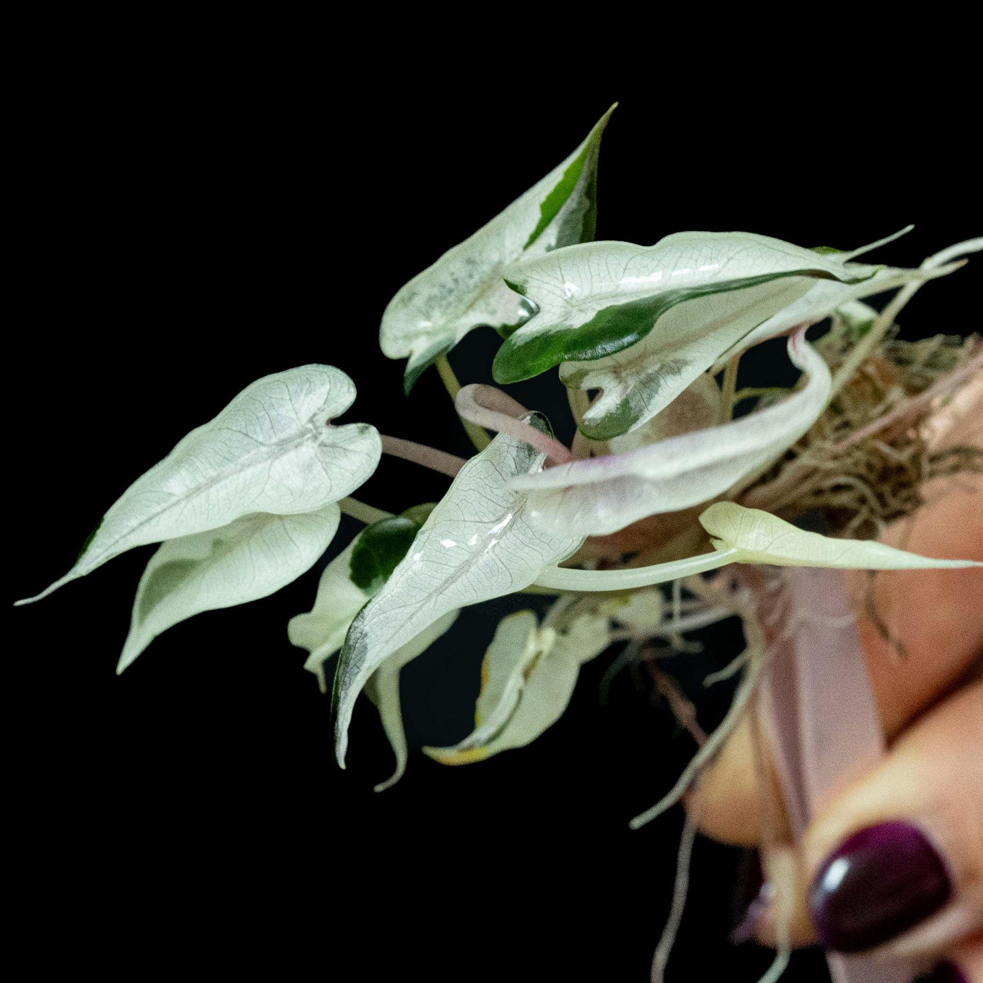 The Alocasia ‘Pink Bambino’ Albo Variegated is a rare gem featuring elegant white leaves adorned with delicate pink accents and a compact growth habit that often displays multiple uniquely patterned leaves. If you love pink variegation, this stunning plant is a must-have addition to your collection.