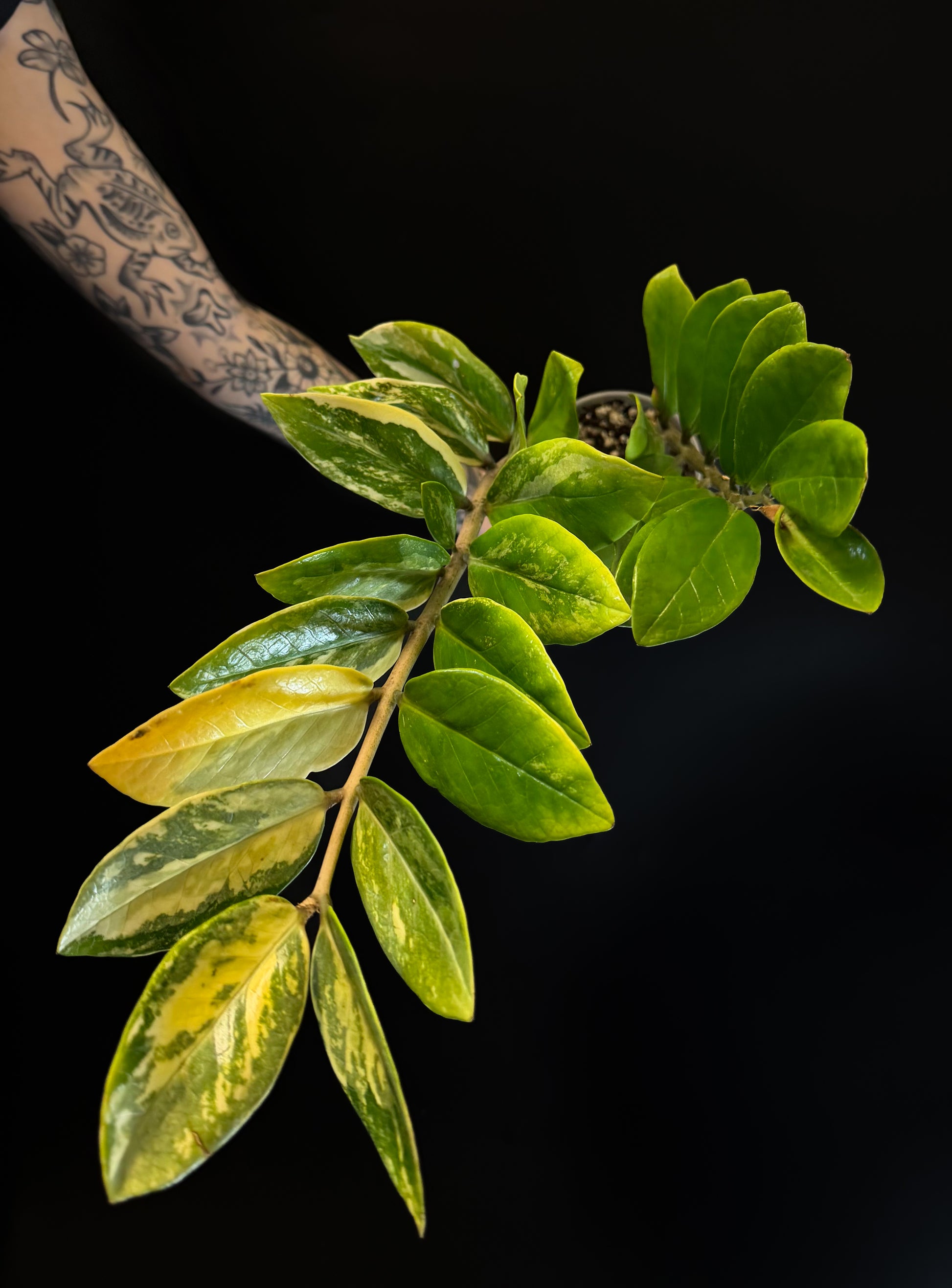Zamioculcas Zamiifolia Variegated, or the variegated form of the "ZZ" plant, is a slow growing, rare tropical aroid plant. It is known for its striking green, white, and yellow marbled leaves.
